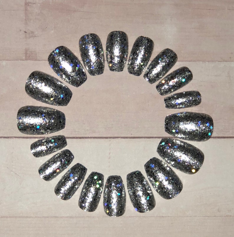 Silver Glitter Coffin Nails Fake Nails False Nails Faux Etsy